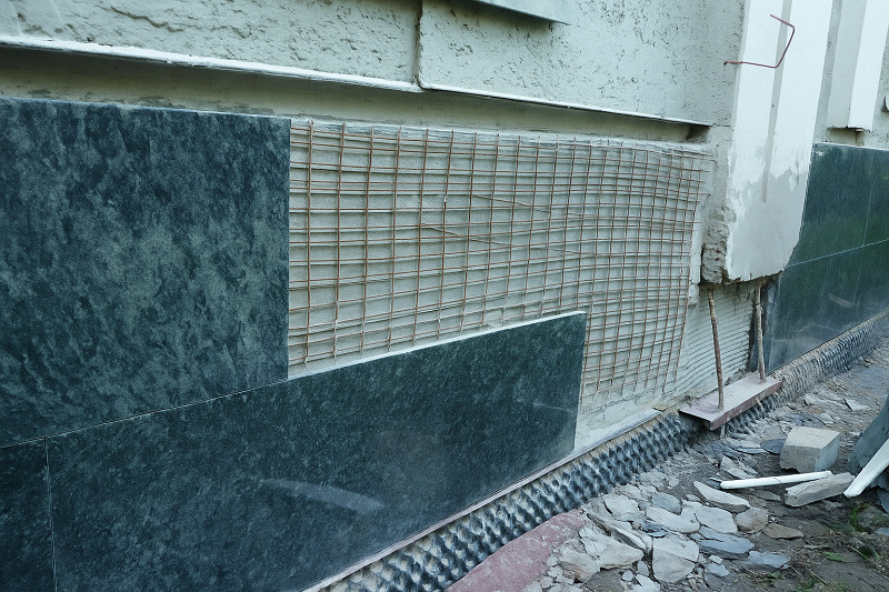сцепление плитки. Важно также учитывать материал стен: для красного кирпича не требуется установка металлической фасадной сетки, тогда как для стен из газоблока или пеноблока такая сетка обязательна. Фасадная сетка крепится дюбелями, причем на 1 квадратный метр необходимо использовать 10-15 дюбелей. Идеальным вариантом являются отштукатуренные стены, которые просто очищаются от пыли, что минимизирует расход клея.